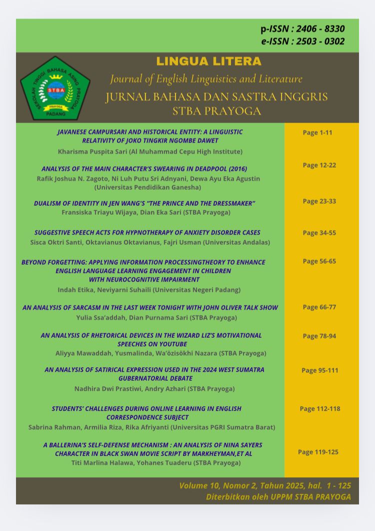 This study examines speech acts of suggestive language in individuals experiencing anxiety disorders within hypnotherapy practice. The research investigates the types of speech acts used during hypnosis sessions with a client experiencing anxiety. This study employs a qualitative descriptive approach, grounded in speech act theory by Austin (1962), Searle (1969), and Wijana (1996). Data were collected using the observation method. We presented he findings informally, explaining the results in the author's own words.We obtained from a single hypnotherapy session involving a client with anxiety. The results indicate six types of suggestive language used in hypnosis: suggestions, commands, prohibitions, statements, expressions of praise, and questions. Suggestive language, in the form of questions, encourages reflection and internal decision-making in the Client, without issuing direct commands, in accordance with direct and indirect non-literal speech acts. Suggestive language in the form of questions highlights a linguistic gap between conventional theory and hypnotherapy practice, opening new avenues for development in pragmatics and applied linguistics, particularly in therapeutic communication.